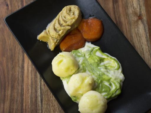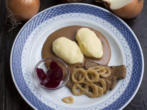 Rullesteg med kartofler, skysovs, rødkål og agurkesalat (cremet)