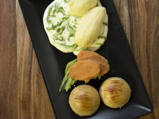 Når der er almindelige kartofler på menuen, kan mosen formes med en varm ske, så det ligner almindelig kartofler. Kom evt. en urteolie ovenpå kartoflerne for at skabe noget farve i retten. Kan også anvendes som kolde kartofler til smørrebrød.