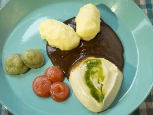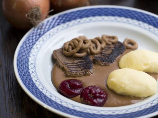 Rullesteg med kartofler, skysovs, rødkål og agurkesalat (cremet)